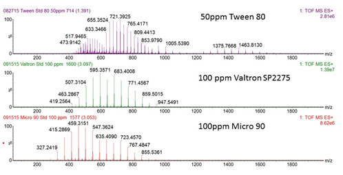 Mass spectral “fingerprints” provide highly resolved chemical images of a sample, much more specific than FTIR which is a chemical fingerprinting analytical tool routinely employed in QC/QA testing. The mass spectra of three different aqueous non-ionic detergent solutions in the figure below display obvious differences even though the three surfactants are chemically very similar.