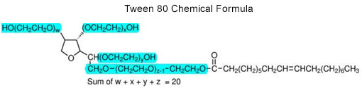 These non-ionic surfactants are mainly comprised of polyoxyethylene (POE) hydrophilic polymer units and thus one might expect their mass spectra to be equivalent. In fact, they are not equivalent due to fine differences in chemical structure that high resolution accurate mass spectrometry can readily detect. POE polymer chains differ in their molecular weight, i.e. number of repeats, and are also terminated or otherwise functionalized by distinguishing chemical groups as illustrated in the idealized structure of Tween 80 (PEO moiety is highlighted in blue in the lower figure; the end group is unhighlighted). These differences in molecular weight and functional group character are the structural features that lead to the conspicuously different surfactant fingerprints.